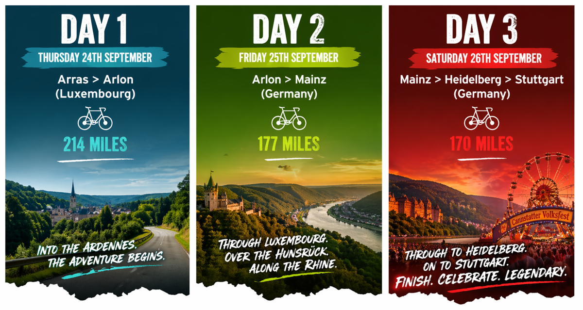 The journey begins in Arras, Northern France, where teams will arrive on the afternoon of Wednesday 23rd September. Accommodation is arranged for all riders, with the evening free to enjoy dinner in one of the many restaurants around the beautiful Place des Héros — a relaxed start before the challenge begins.